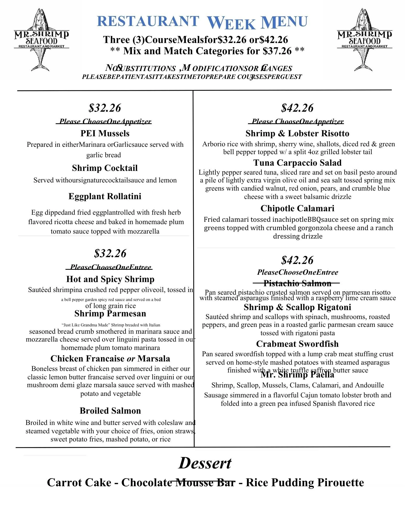 Dinner Specials Restaurant Week Available after 4pm for Dine In Only - Takeout Specials Below Click for PDF of Dinner Specials Click for PDF of Dinner Specials